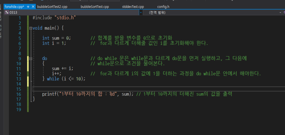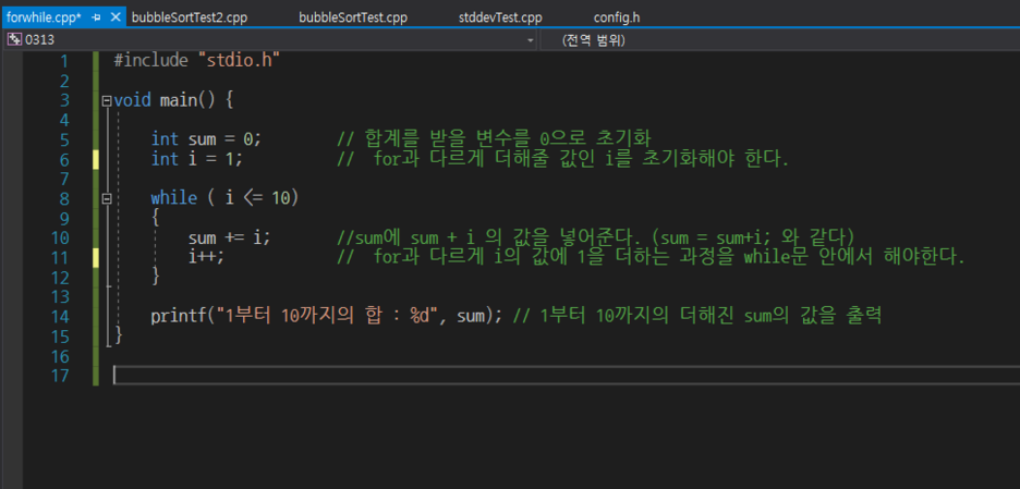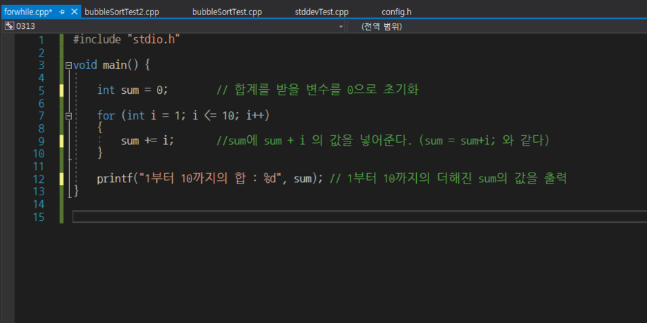 먼저 메인 함수 안에서 합계를 받을 변수 sum을 0으로 초기화해줍니다. 초기화를 반드시 해주어야 합니다. 변수를 처음 만들었을 때 그 변수 안에는 쓰레기값이 들어가 있습니다. 그 쓰레기를 비워주고 우리가 처리할 값을 넣어줘야 합니다.