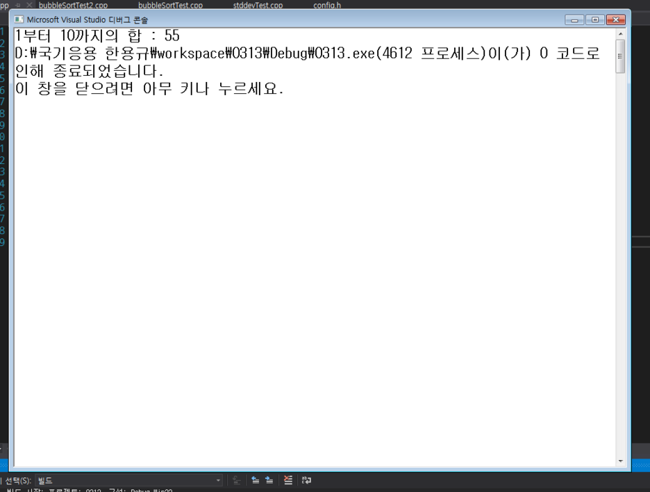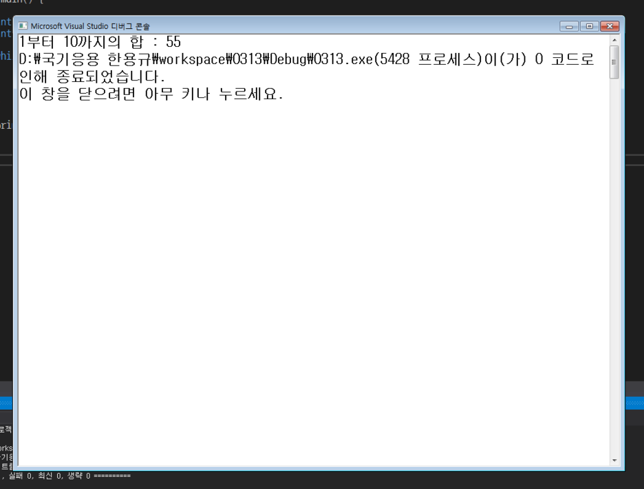 짠~ 이렇게 1부터 10까지의 합인 55가 정상적으로 반복 계산되었음을 알 수 있습니다.
