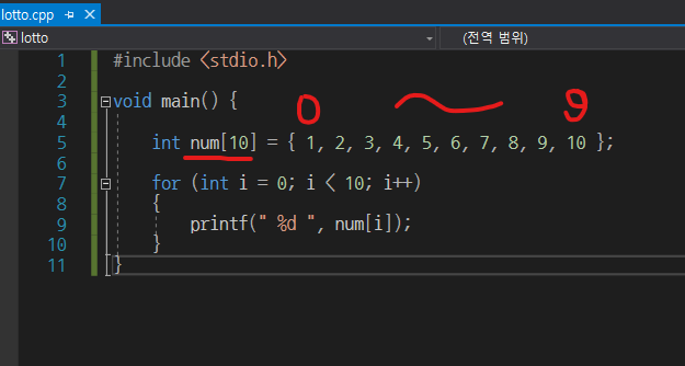 num이 배열의 이름이고 [10]은 배열의 크기를 말합니다. 즉, 정수(int)를 받는 10개짜리 크기의 num배열을 만들어준 것입니다. 그리고, num이란 배열을 선언하면서 동시에 값을 1부터 10까지로 초기화해주었습니다.