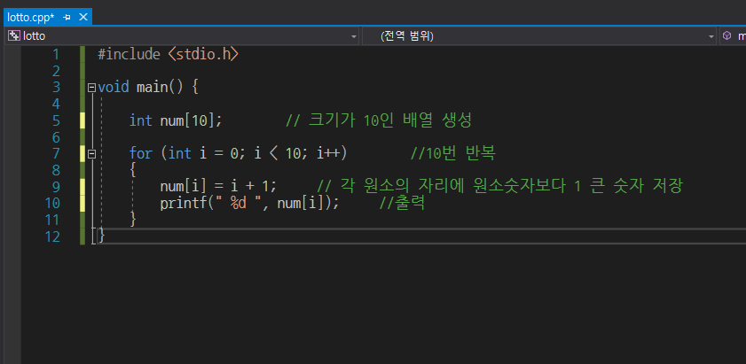 그리고 이 코드를 작성해주세요. 맨 윗줄이 배열을 생성하는 부분입니다.