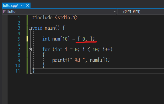 이렇게 선언하는 방법이 있습니다. 이건, num[10]이라는 배열의 각각의 원소에 0이라는 값을 모두 초기화시켜주는 것입니다. 0번째부터 9번째까지 모두 0이란 값을 저장시킬 수 있습니다.