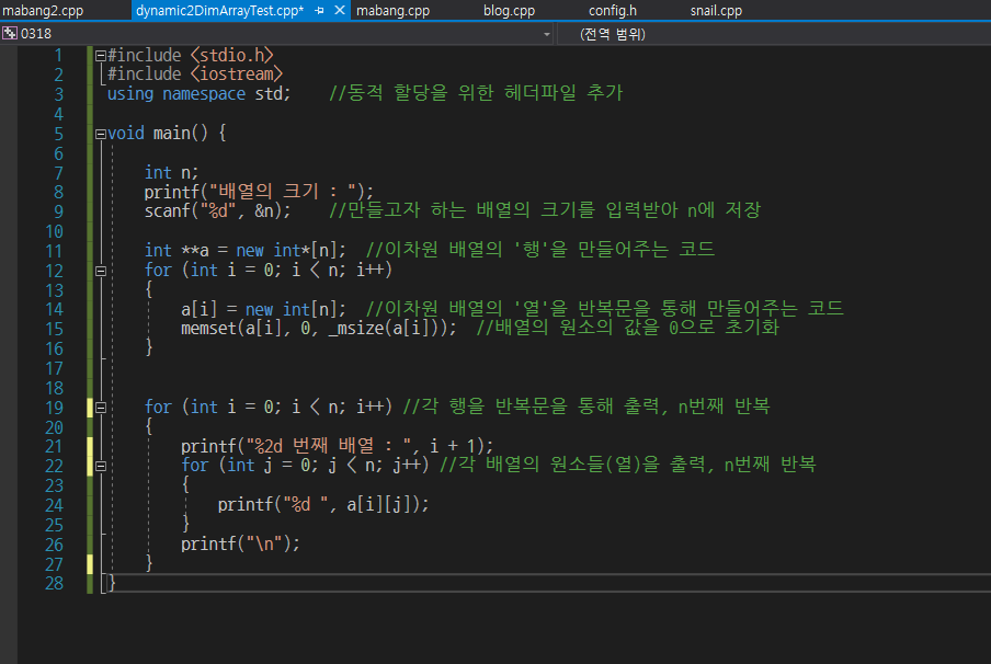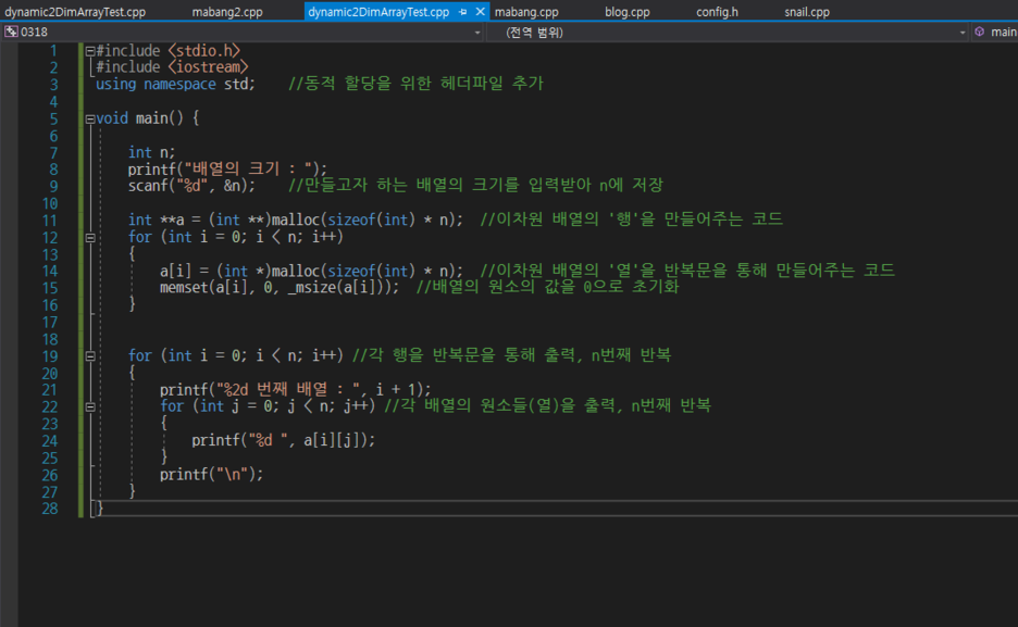 예전에 메모리 동적 할당을 이용해서 일차원 배열 만들고 출력하기는 해보았는데요. 이번에는 약간 복잡한 이차원 배열입니다. 하지만 막상 코딩해보면 그다지 어렵지는 않습니다.