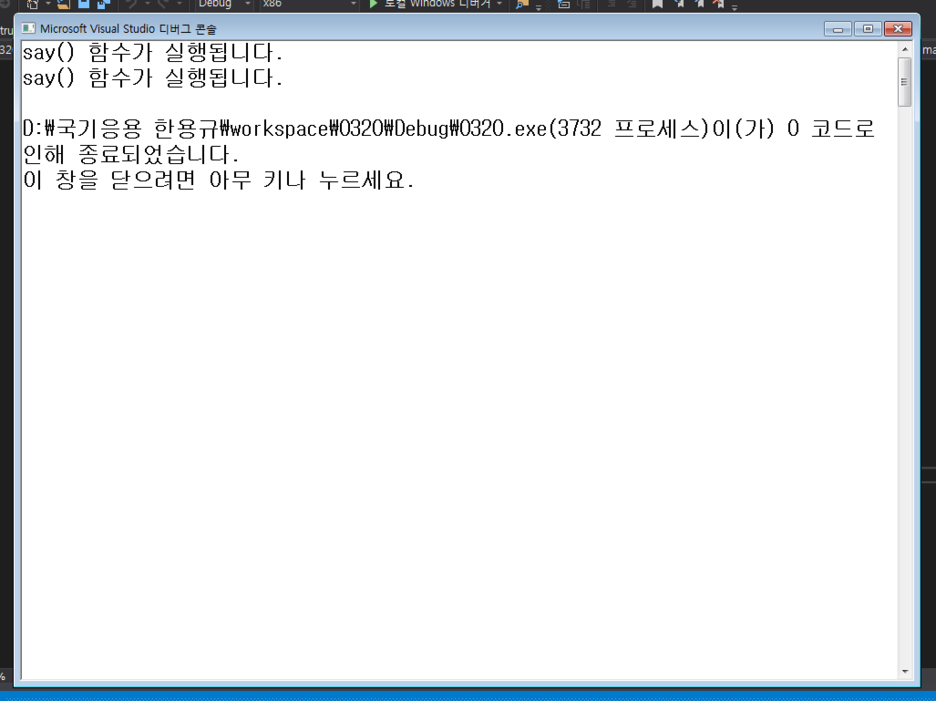 이렇게 콘솔창이 실행되는 것을 알 수 있습니다. c1과 c2에 있는 두 함수가 정상적으로 실행된 것을 알 수 있습니다. 이처럼 클래스는 여러 가지 변수와 함수를 처리함에 있어서 아주 유용한 기능이기 때문에 반드시 잘 익혀야 합니다. 또한 이 클래스는 추후에 배우게 될 자바에서는 주구장창 봐야하는 아이입니다. 그래서 이 클래스에 대한 개념을 충분히 익히고 넘어가는 것을 추천드립니다.