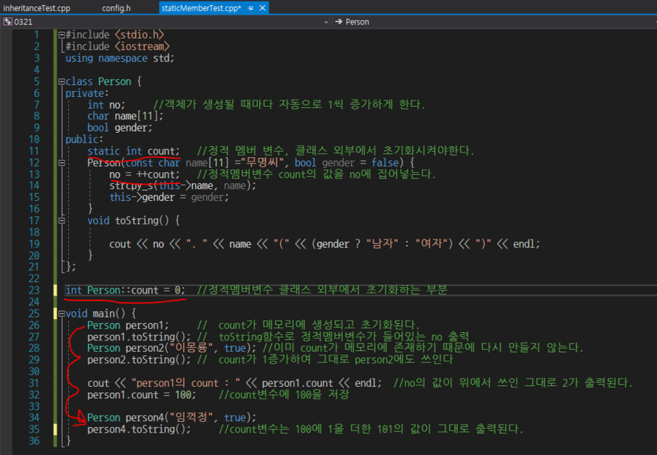 static int count는 정적 멤버 변수이기 때문에 모든 객체가 공유하여 사용합니다.