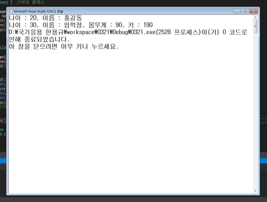 출력을 해보면? child생성자를 통해서 정상적으로 실행될 것입니다. 한번 실행해볼까요?