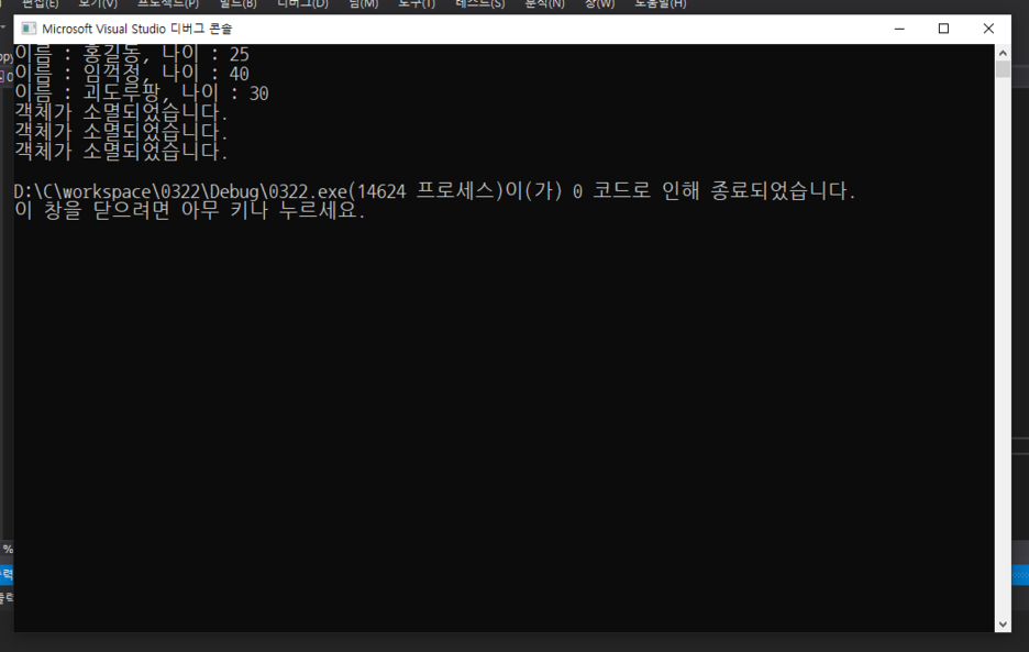 또한 객체가 소멸될 때 소멸자 함수가 자동으로 실행되는 것을 알 수 있습니다.