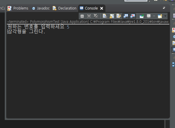 5번을 입력하니까 TriAngle 클래스의 draw() 메소드가 실행되는 것을 볼 수 있습니다.