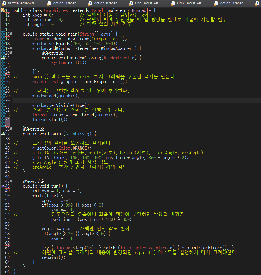 이렇게 팩맨이 좌우로 왔다갔다거리면서 입을 계속 움직이는것을 볼 수 있습니다. 이처럼 Panel클래스를 상속받으면 paint() 메소드를 오버라이드해서 그래픽을 구현할 수 있습니다. 이것은 윈도우 관련 프로그래밍에서 그래픽을 구현하기 위해서 아주 기초적인 작업이라고 할 수 있겠습니다. 위에 써놓은 메소드 말고도 그래픽 관련해서 참 많은 메소드가 있습니다. 충분한 연습을 통해서 익숙해지면 프로그래밍에 큰 도움이 될 것입니다. 읽어주셔서 감사합니다.