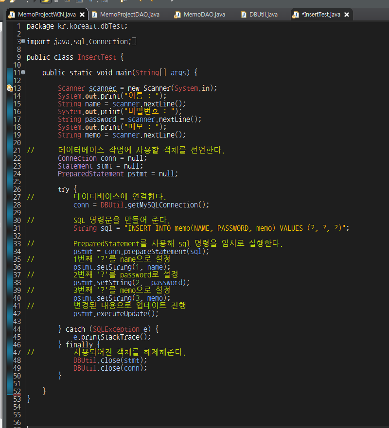 이렇게 코딩해보았습니다. SQL 명령문을 PreparedStatement를 사용해서 임시로 실행하는 작업이 들어갔습니다. 한번 컴파일해보겠습니다.